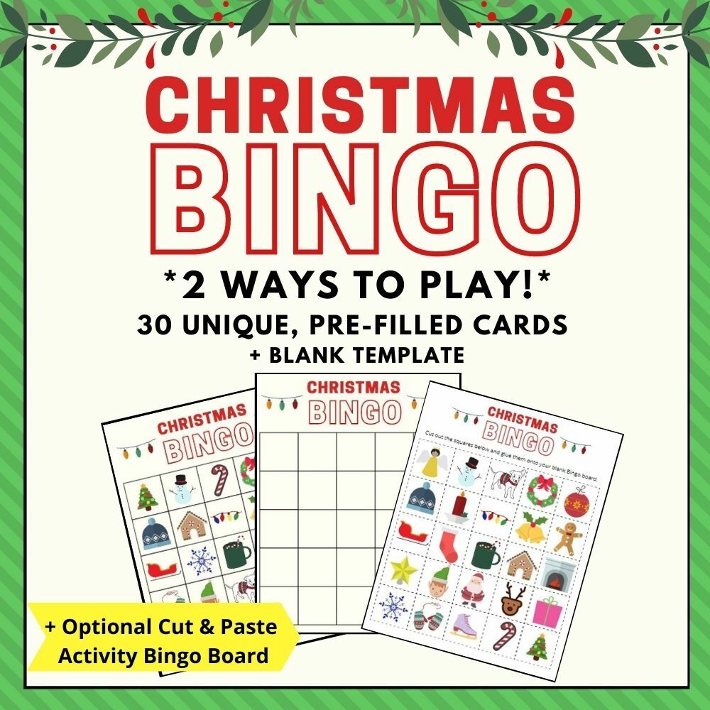 You'll get 30 unique, pre-filled Christmas Bingo boards + a blank bingo board and bingo tile template for cutting and pasting.